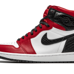 The Women’s Air Jordan 1 High “Satin Snake” is an eccentric colorway in women’s sizing of Michael Jordan’s popular signature shoe. Jordan Brand’s reimagining of the classic “Chicago” design in lifestyle materials such as satin and faux snakeskin continues on this luxurious “Satin Snake” makeup. Keeping the color block close to the original “Chicago” colorway, the upper features a white leather mid-panel and perforated toe. Contrasting red leather overlays dot the forefoot, eyelets, and collar. A black snakeskin leather covers the Swoosh, ankle collar, and heel. Red satin is utilized for the tongue and inner lining, while waxed black cotton laces finish the look of this opulent Jordan 1 in women’s sizing. Release date: August 6, 2020.