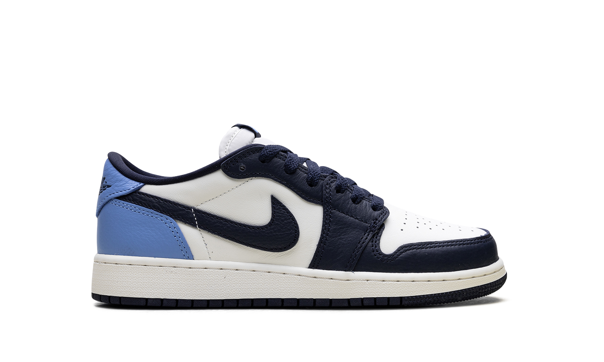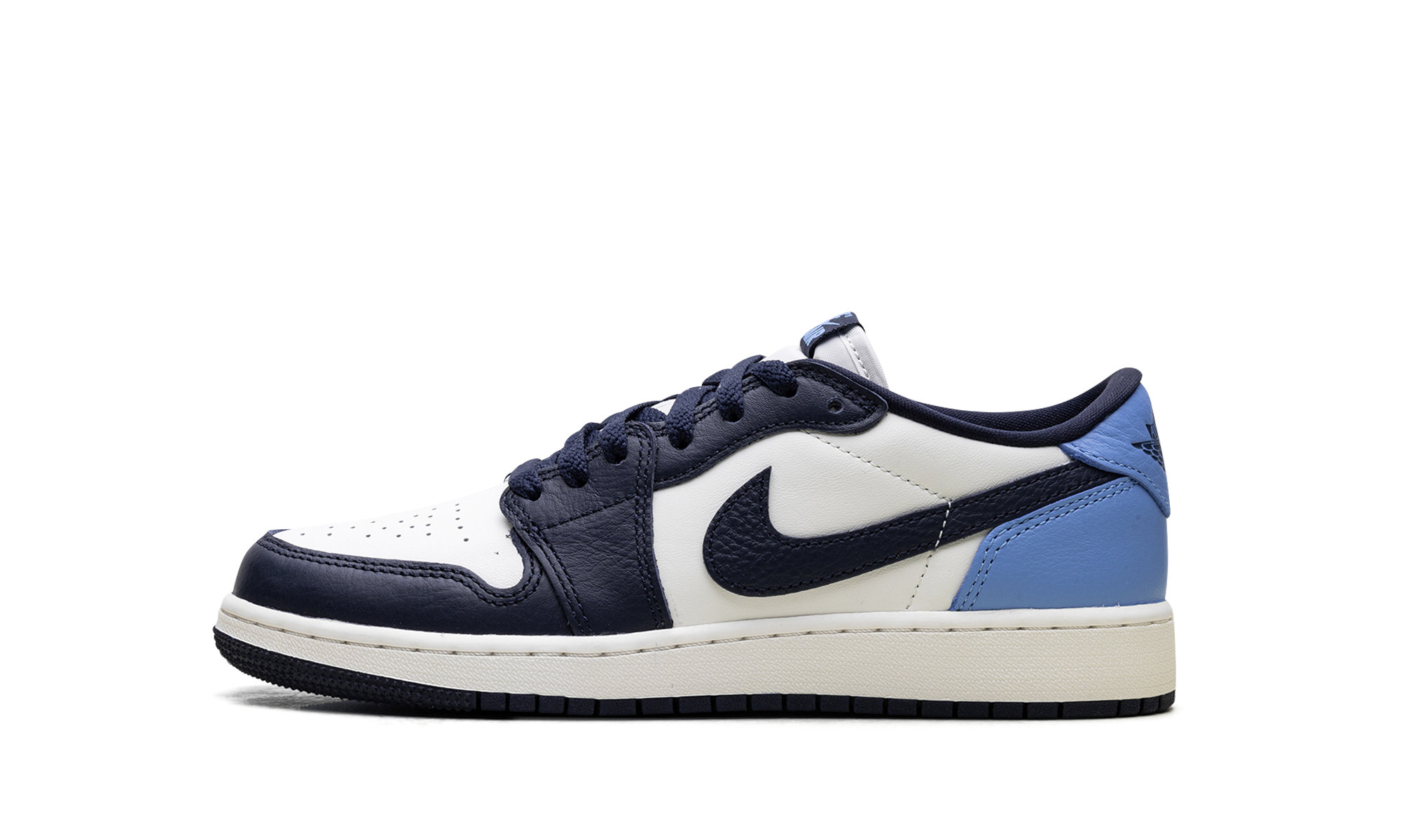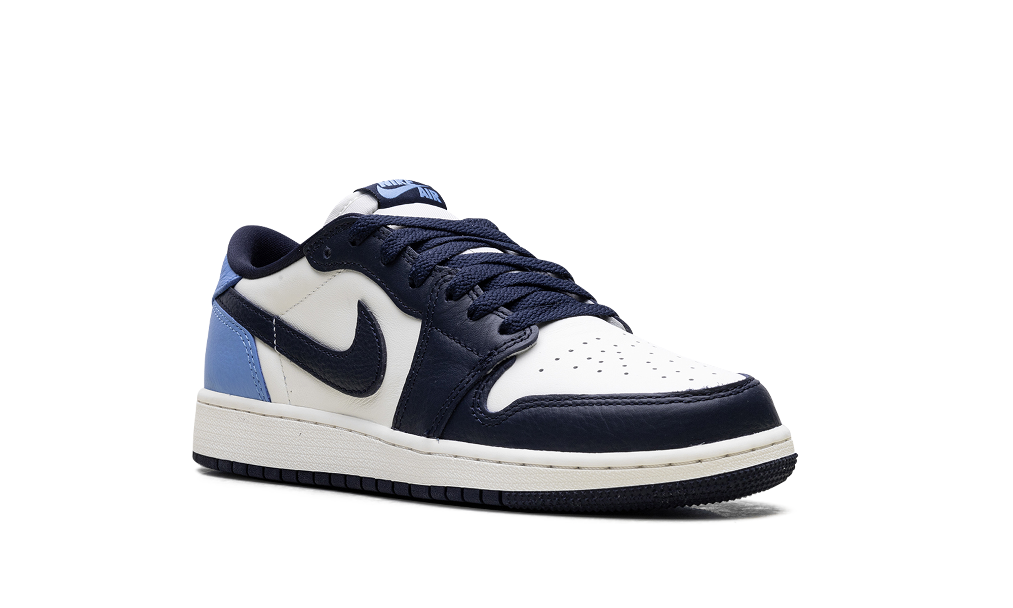 The Air Jordan 1 Low GS “Obisidian” is the grade school version of the 2025 lowtop. The kids’ AJ1 Low OG “Obisidian” has a leather upper that combines shades of navy and light blue with off-white. The lowtop Jordan 1 has a Wings logo on the heel and a navy Swoosh.