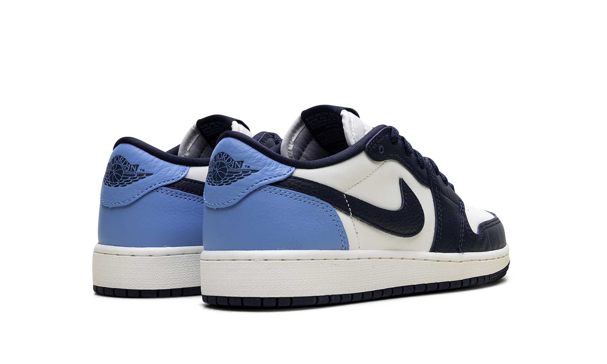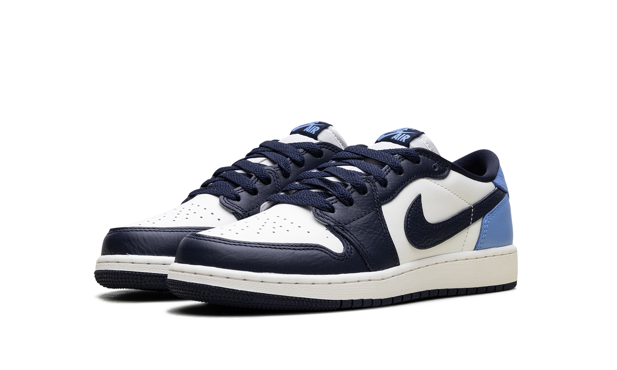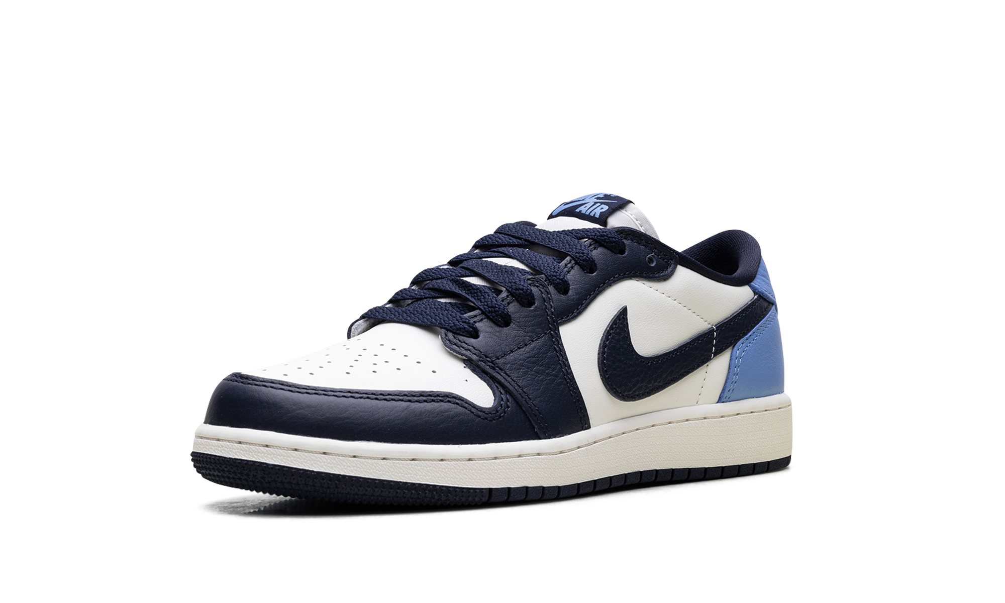 The Air Jordan 1 Low GS “Obisidian” is the grade school version of the 2025 lowtop. The kids’ AJ1 Low OG “Obisidian” has a leather upper that combines shades of navy and light blue with off-white. The lowtop Jordan 1 has a Wings logo on the heel and a navy Swoosh.