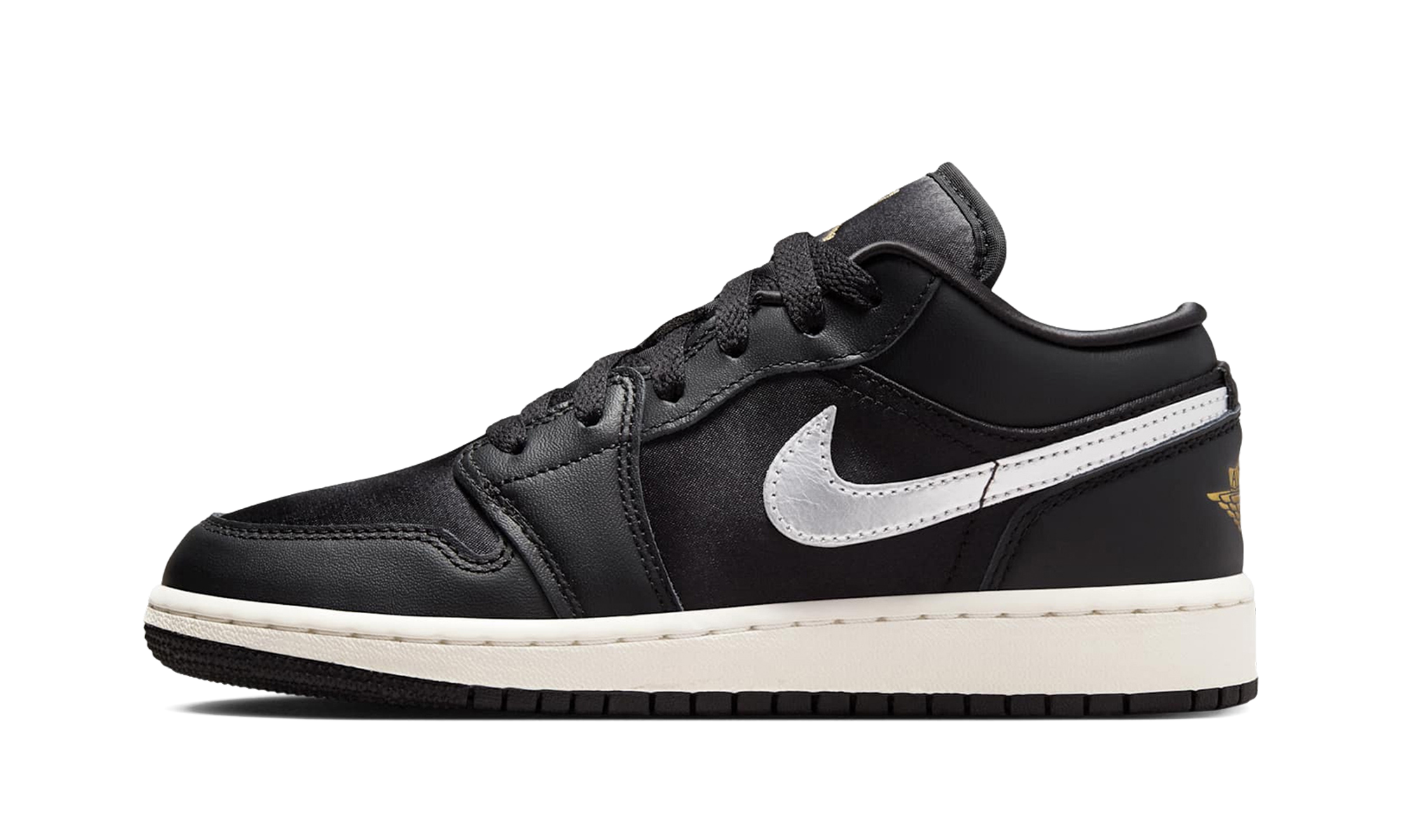 Step into the Air Jordan 1 Low SE PS “Black Metallic Gold,” a preschool-sized special edition sneaker. This low-top shoe features a striking color scheme primarily composed of Black and Metallic Gold. It maintains the classic Air Jordan 1 design and uses a durable construction for an iconic look with lasting wear.