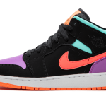 The Air Jordan 1 Mid GS “Black/Orange/Purple” in youth sizing is a colorful take on the mid-top Air Jordan 1. Even in grade school sizing, the Air Jordan 1 Mid shares many of the same elements of the classic high-top as it features a black nubuck base that covers the mid-panel, collar, and toe cap. Lively color contrasting appears on the Swoosh-branded mid-panel, with a perforated purple nubuck toe on the left shoe and a perforated turquoise nubuck covering the right shoe. Purple accenting appears on the ankle collar beneath the black overlays on the right shoe with turquoise peeking beneath the same overlay on the left shoe. Further mismatching can be found on the tongue tags with an orange base composing the left shoe and a vibrant pink base covering the right shoe. Lastly, a white rubber sole with mismatched outsoles puts the finishing touches on the playful Air Jordan 1 Mid in youth sizing.