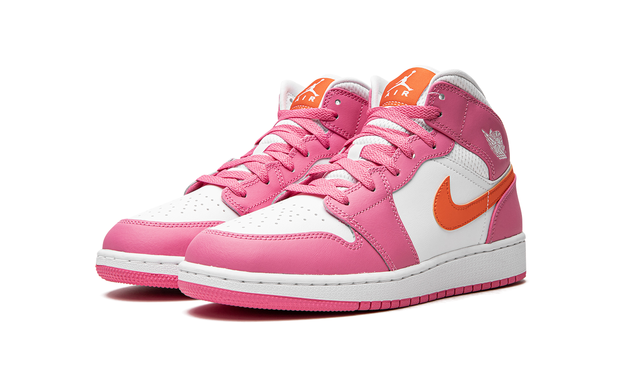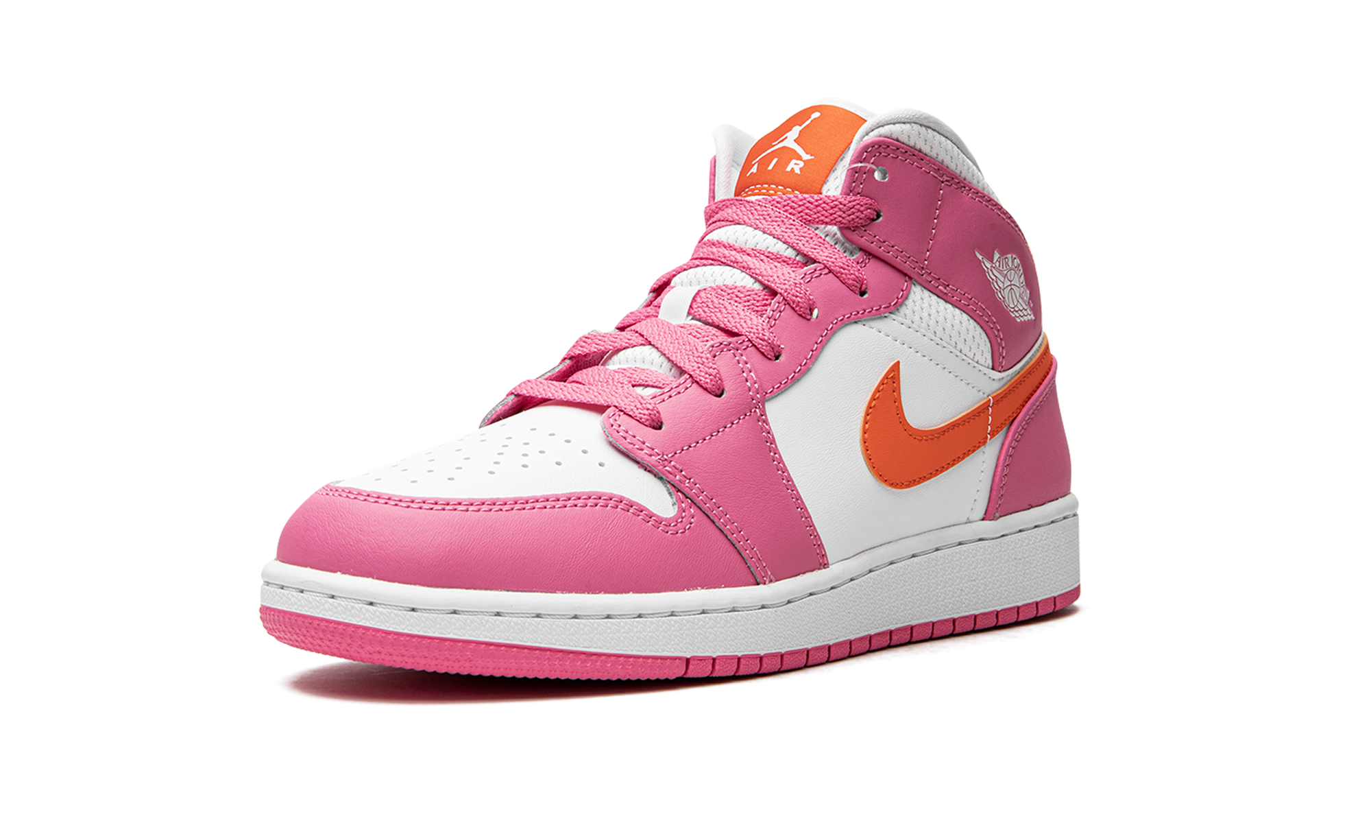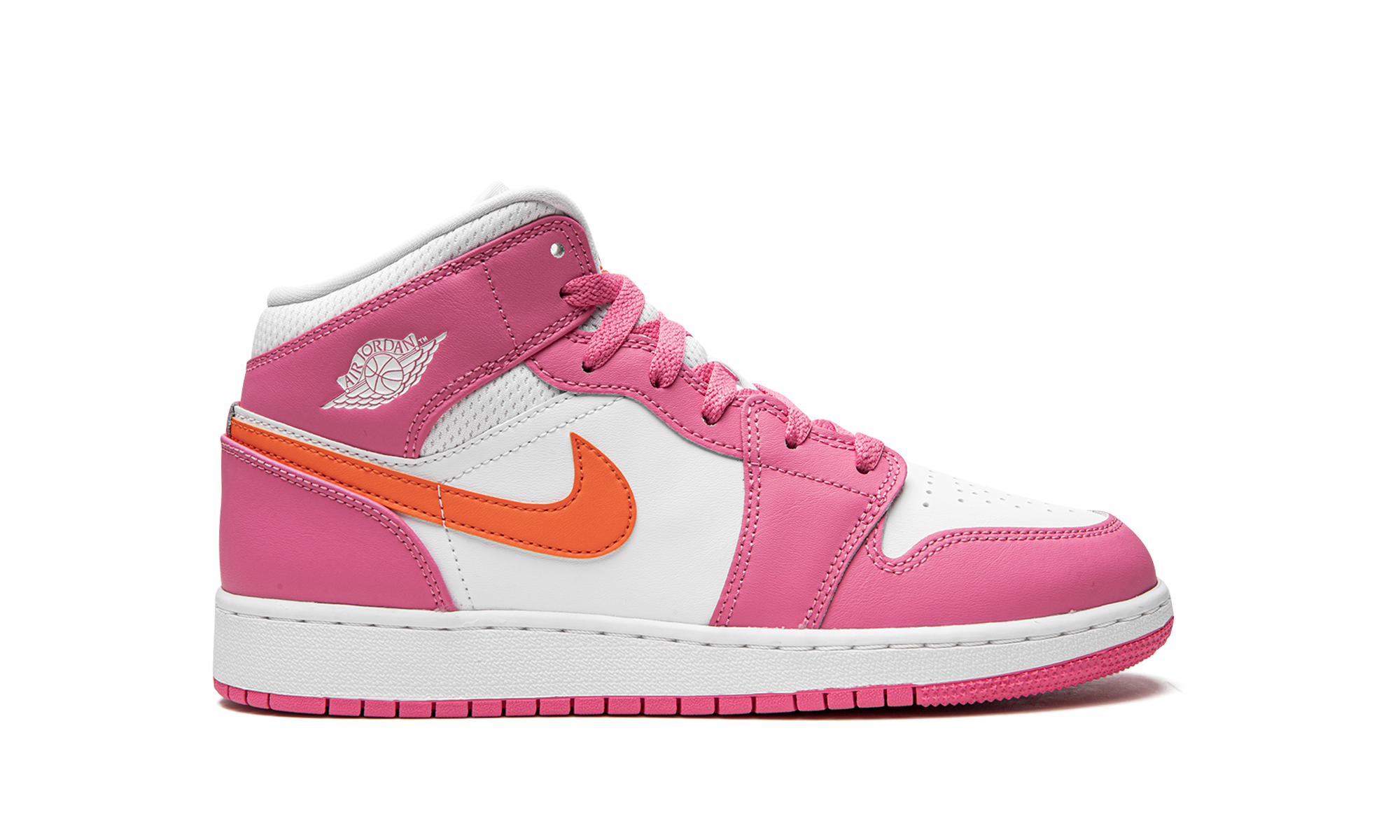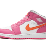 The Air Jordan 1 Mid GS “Pinksicle” is a fun and colorful look for popular silhouette for kids. The eye-catching design features a white leather base with mesh around the ankle, which is all layered with a bright shade of pink that Nike is dubbing Pinksicle across the rest of the upper. Orange accents also come into play for the side Swooshes and Jumpman tongue tag.