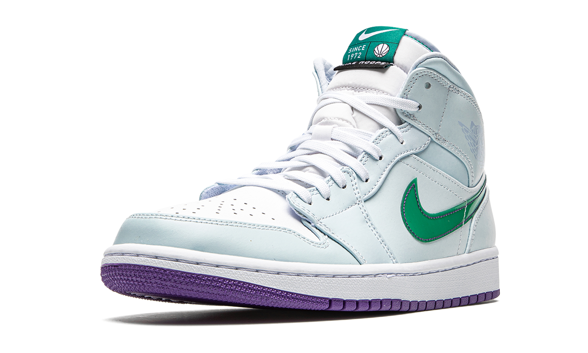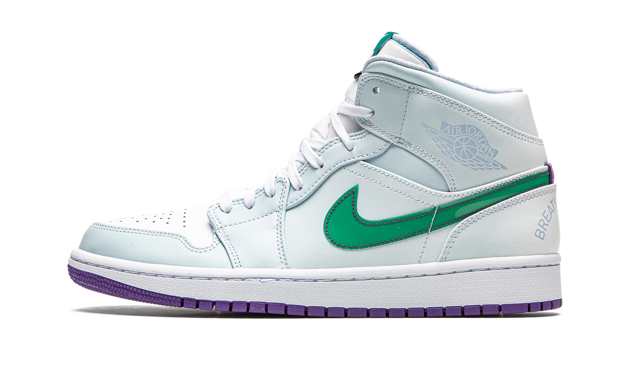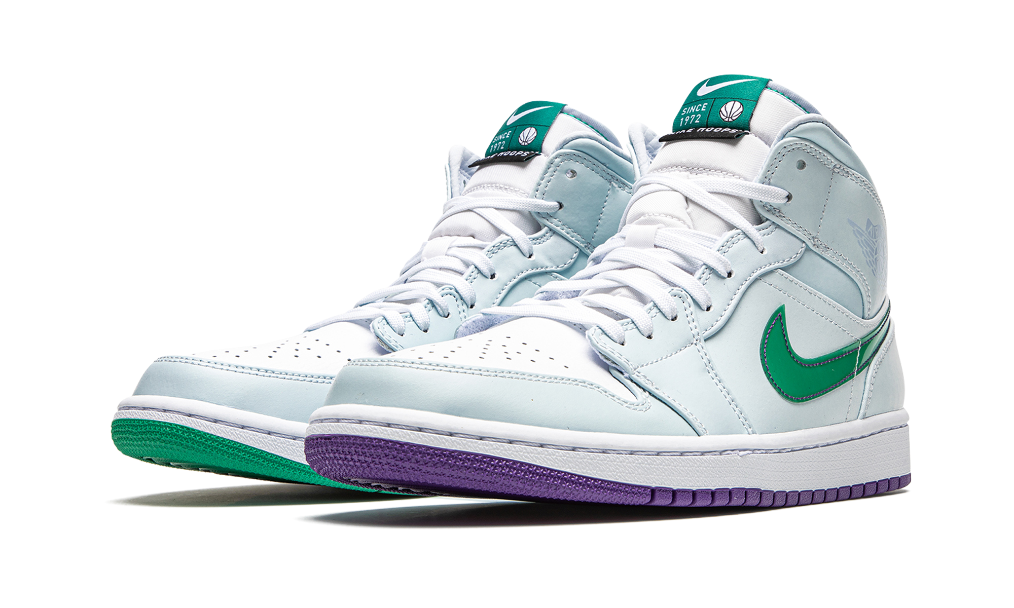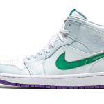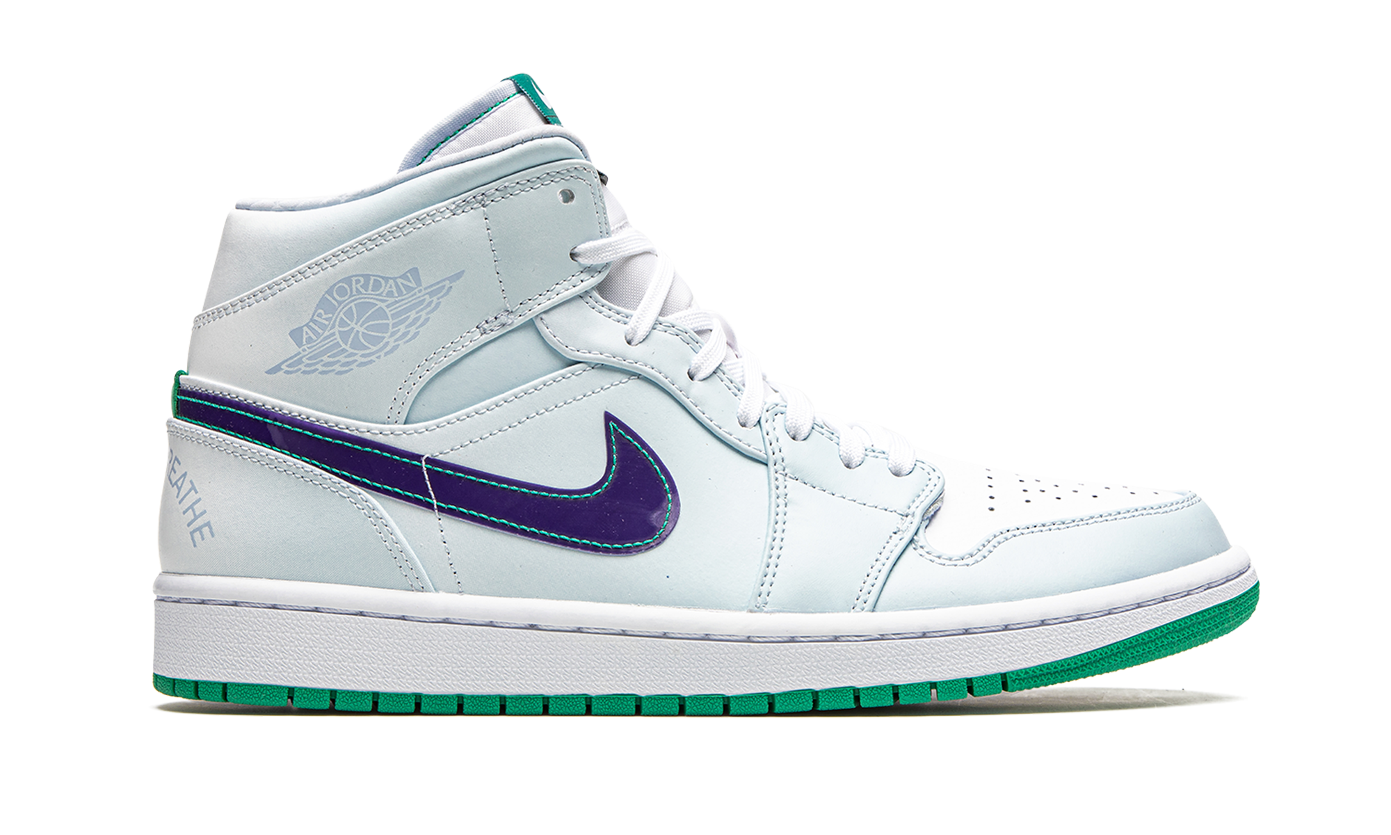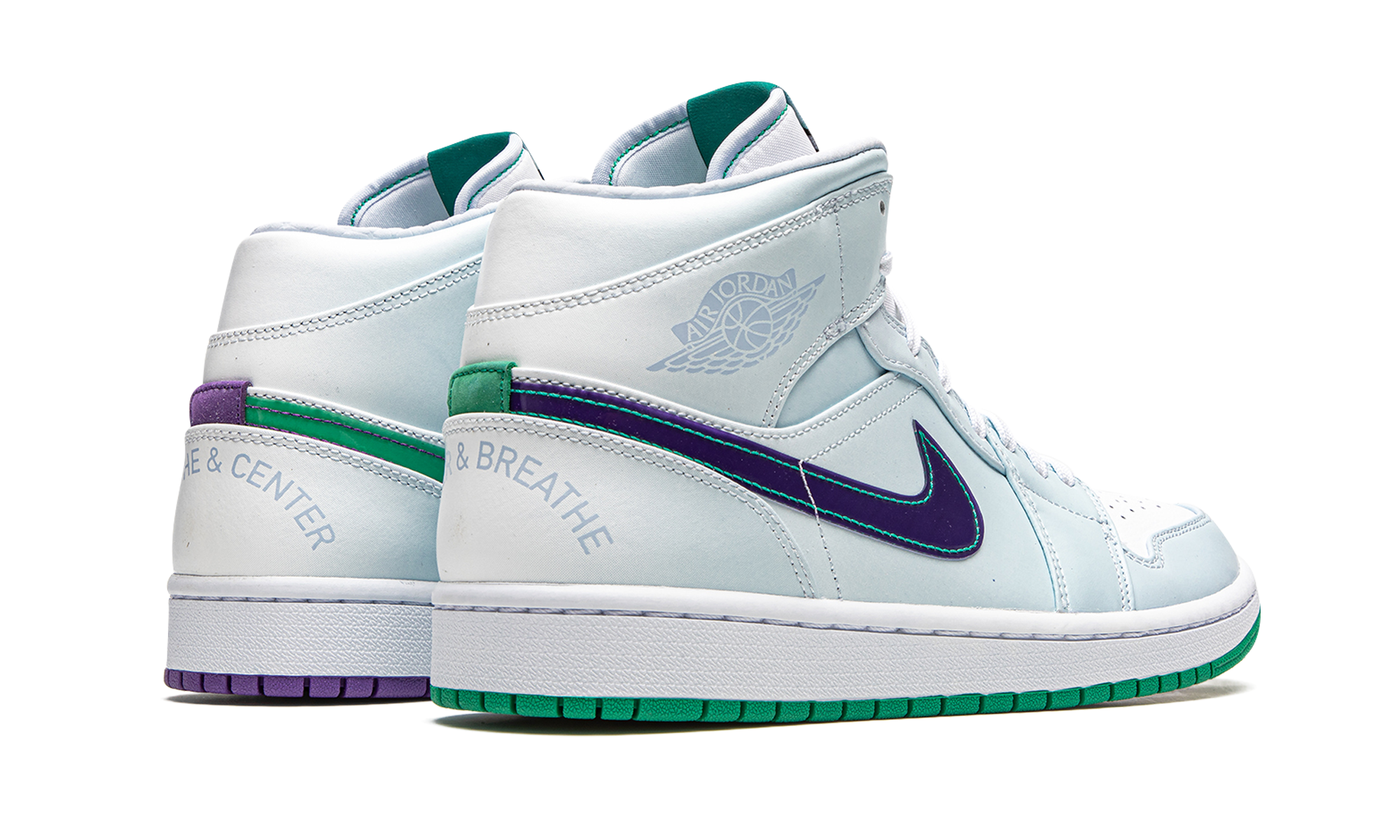 The Air Jordan 1 Mid “Nike Hoops – Luka Doncic” is the star NBA player’s first signature colorway with Jordan Brand. Inspired by Doncic’s personal journey toward peace and tranquility, the theme of the silhouette takes on a “mindful” mantra. Unique slogans like “Breathe & Center” and “Center & Breathe” are found on both heels of the shoe. Swooshes in mismatched green and purple hues appear on opposite feet, which respectively contrast the same two colors on the outsoles. A neutral white leather base, perforated toe for breathability, and “Nike Hoops” tongue tab all add unique styling. The Air Jordan 1 Mid “Nike Hoops – Luka Doncic” was released on April 31, 2020.