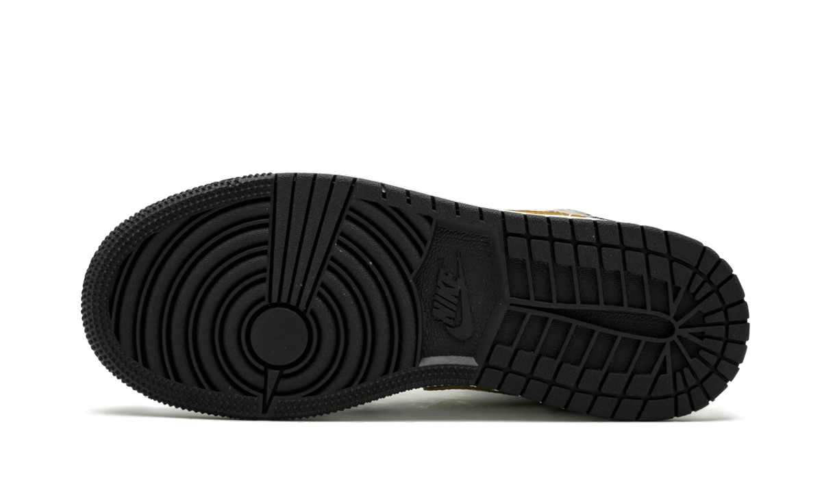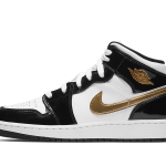 The grade school release of the Air Jordan 1 Mid is outfitted in a clean white, black, and gold color scheme. A white leather upper is given premium accents like black patent leather overlays, and a glossy gold Swoosh. Shiny gold hits also accentuate the Jumpman logo on each tongue and the Wings logo on each ankle.