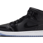 The Air Jordan 1 Mid SE “Space Jam” is a head-turning colorway of the popular lifestyle shoe that is inspired by a classic Air Jordan design. The design we’re referring to is the Air Jordan 11’s “Space Jam” colorway that was worn by Michael Jordan in the movie of the same name. The Jordan 1 Mid “Space Jam” draws favorably from the Jordan 11 in that it is constructed with black patent leather on its design, here on its overlay panels and on the “Wings” branding on the collar and the Swoosh branding found on either side. The shoe’s base is designed in tonal black leather. A white rubber midsole and icy blue translucent rubber outsole completes the “Space Jam” theme.