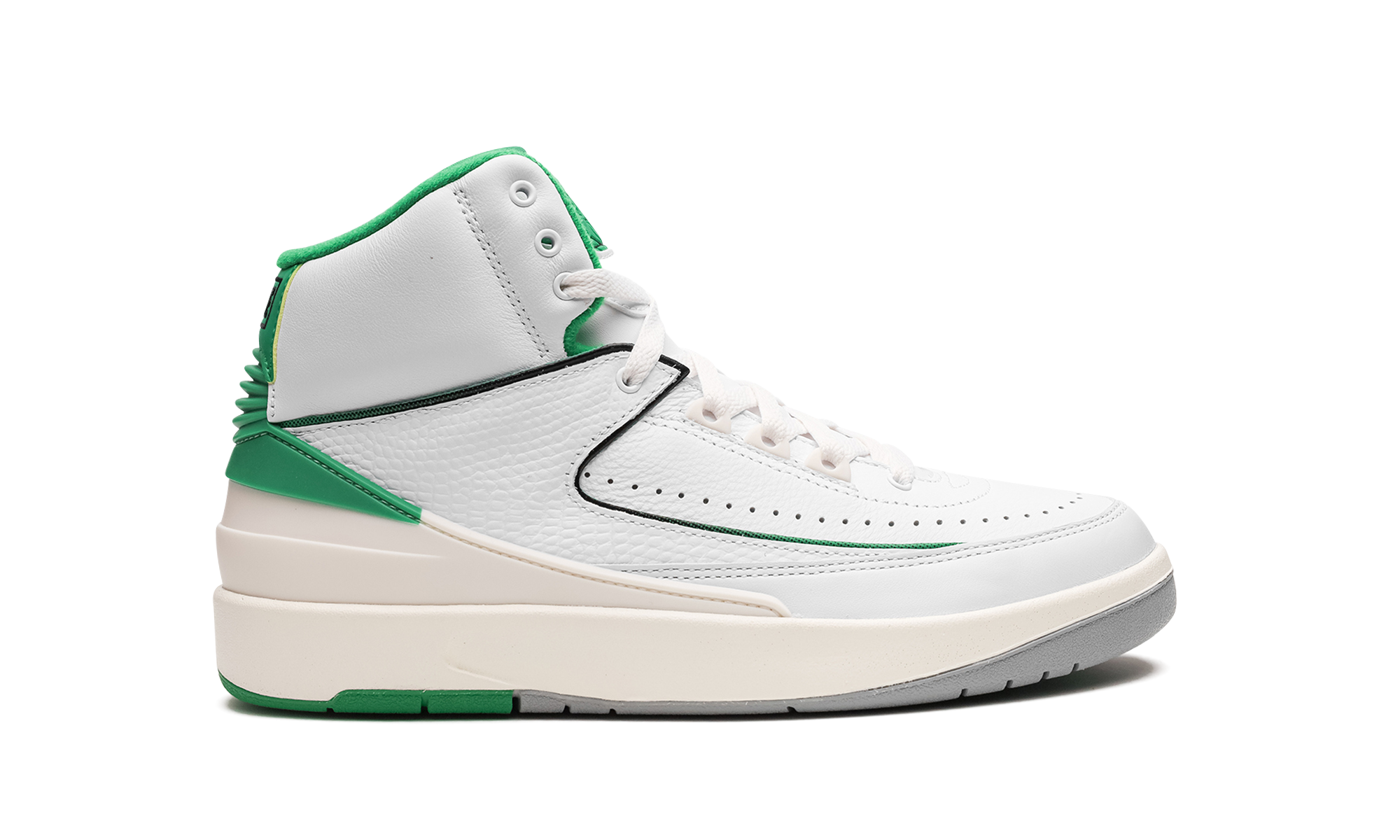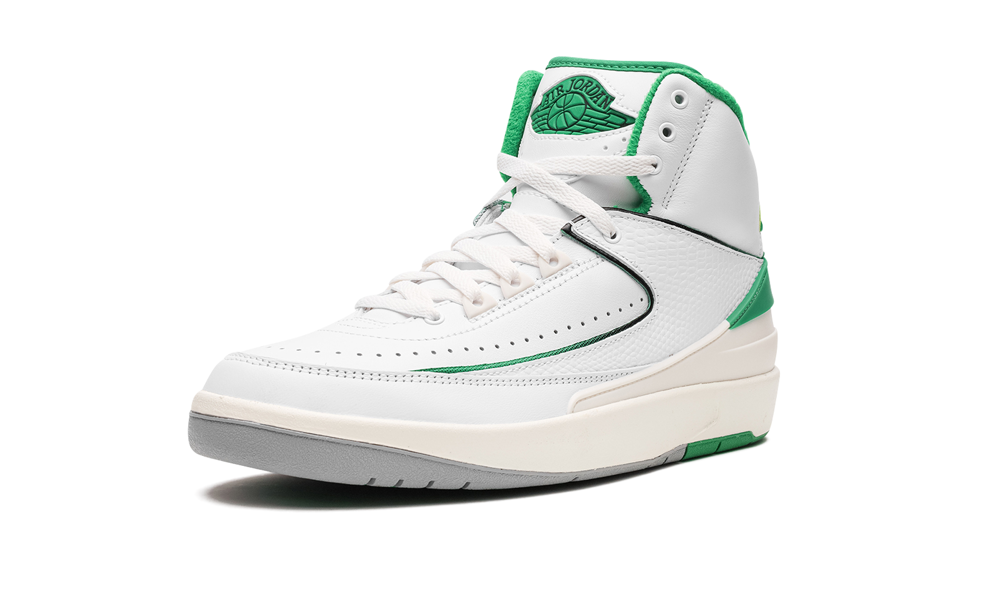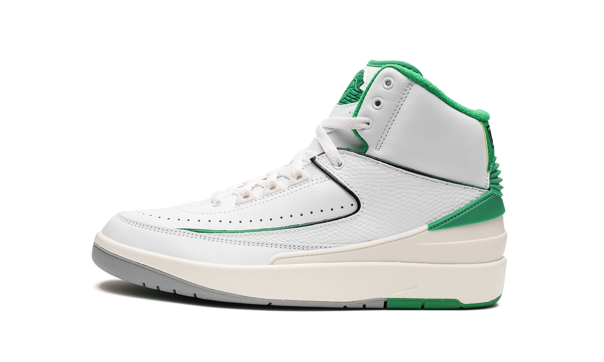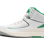 The Air Jordan 2 GS “Lucky Green” is the youth sizing of the colorway for the retro basketball shoe that is loosely inspired by the Boston Celtics. The “Lucky Green” is not officially affiliated with the Celtics, but is nonetheless a show of appreciation to the storied basketball team as it features its white and green team uniform colors on its design. The Jordan 2 “Lucky Green” features a white leather base with tonal textured leather overlays. Lucky Green accenting can be found on the heel counter, interior, and on the “Wings” branding on the tongue. A cream midsole gives the shoe a vintage look. Release date: February 3, 2023