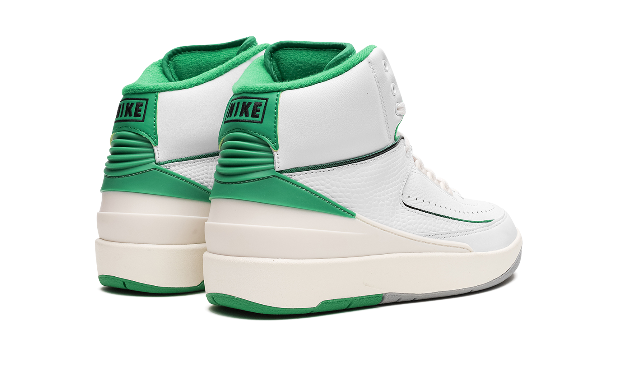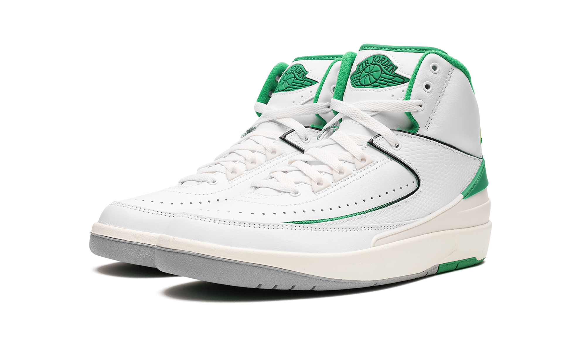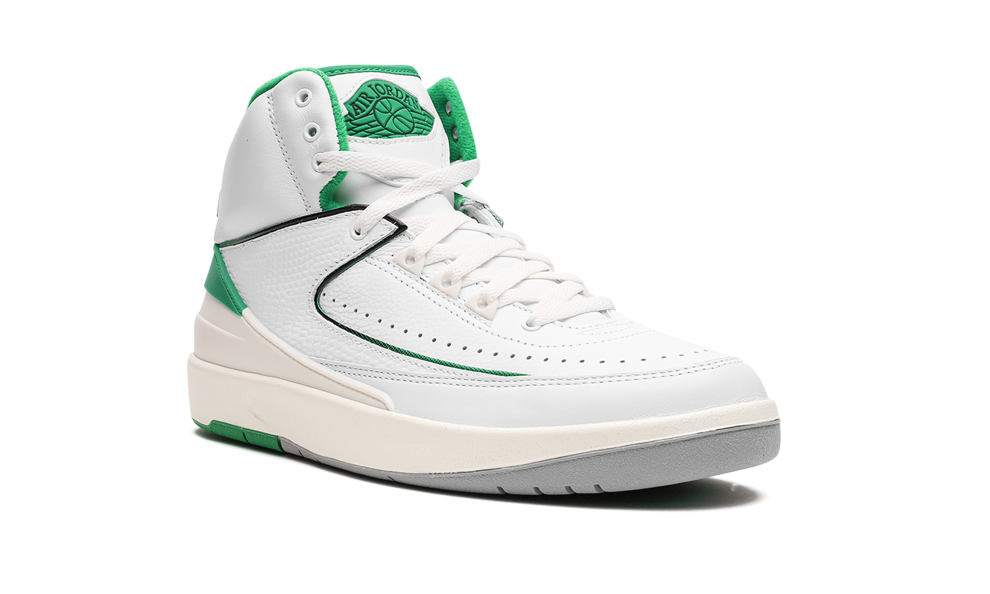 The Air Jordan 2 GS “Lucky Green” is the youth sizing of the colorway for the retro basketball shoe that is loosely inspired by the Boston Celtics. The “Lucky Green” is not officially affiliated with the Celtics, but is nonetheless a show of appreciation to the storied basketball team as it features its white and green team uniform colors on its design. The Jordan 2 “Lucky Green” features a white leather base with tonal textured leather overlays. Lucky Green accenting can be found on the heel counter, interior, and on the “Wings” branding on the tongue. A cream midsole gives the shoe a vintage look. Release date: February 3, 2023
