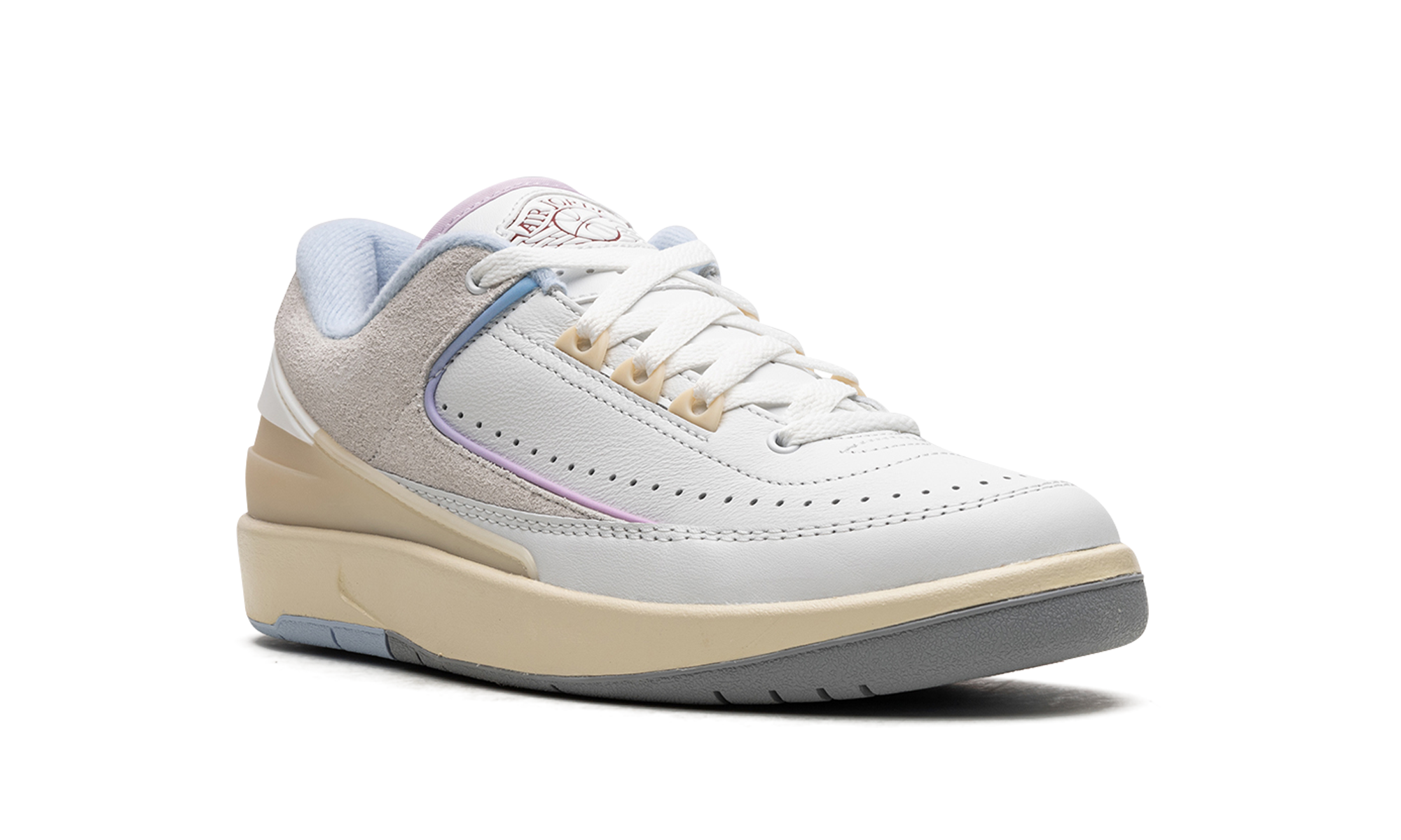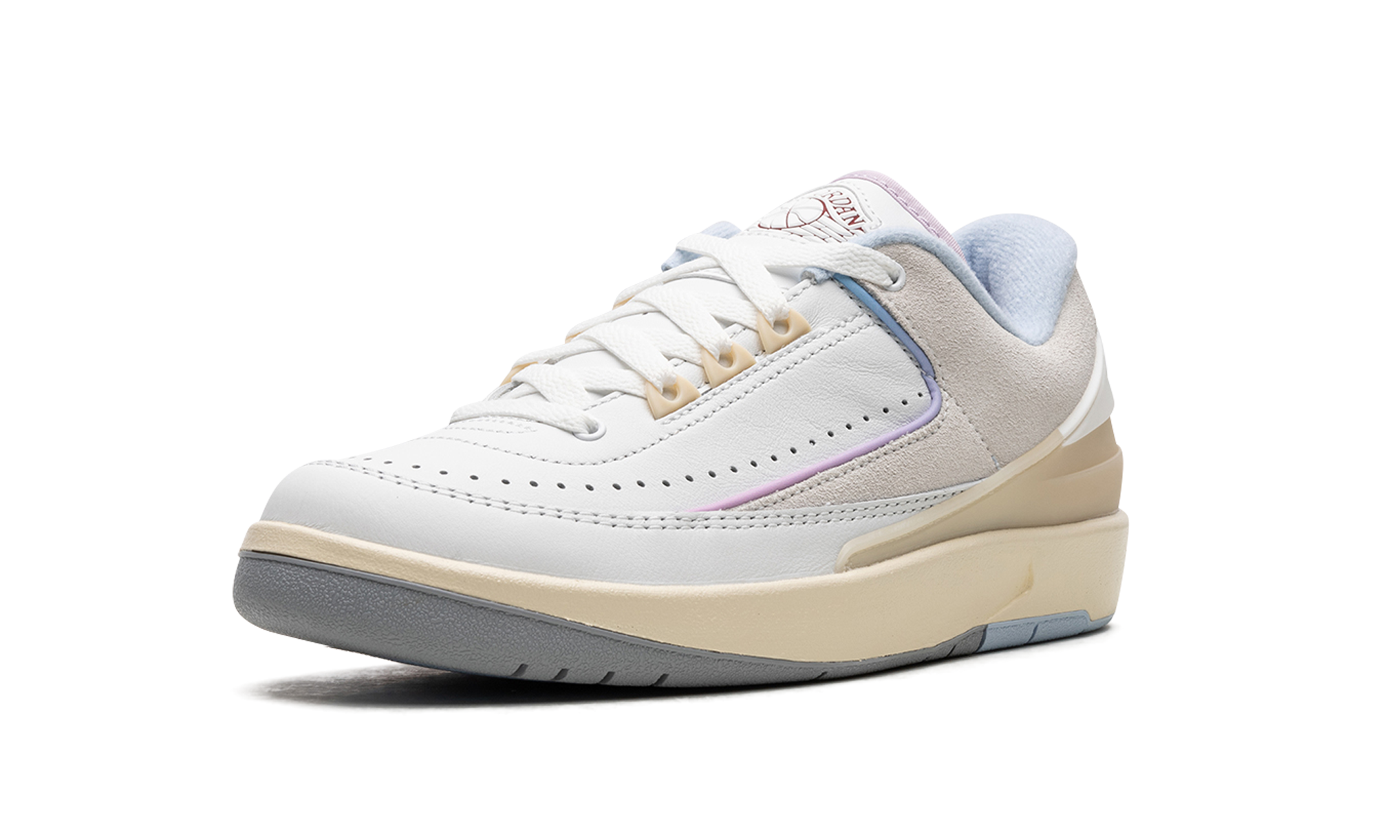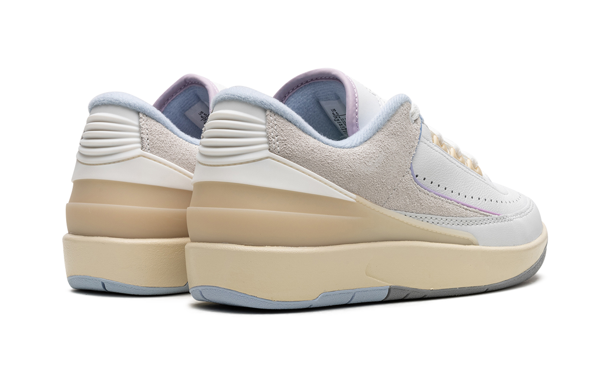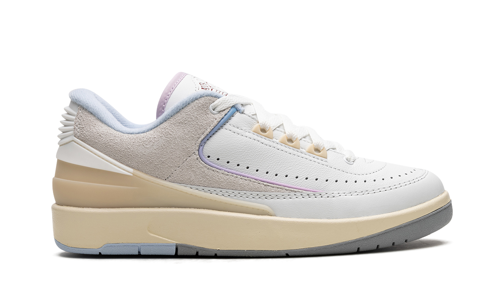 The Women’s Air Jordan 2 Low “Look Up In the Air” is a women’s-exclusive colorway of the retro basketball shoe inspired by one of the model’s classic advertisements from 1987. The advertisement in question features an image of Michael Jordan dunking in a white Air Jordan warm-up suit with a blue/purple/pink sky in the background and the phrase “Look, Up In the Air” printed below. The shoe features a white leather construction with grey suede on the collar. Overtures to the aforementioned sky colors come into play on the gradient purple-to-blue piping along the overlay panels and on the lavender hue found on the underside of the tongue. The phrase “Look, Up in the Air” is printed on the insoles. A classic “Wings” logo appears on the tongue. The cream rubber midsole gives the shoe a vintage look. Release date: June 22, 2023