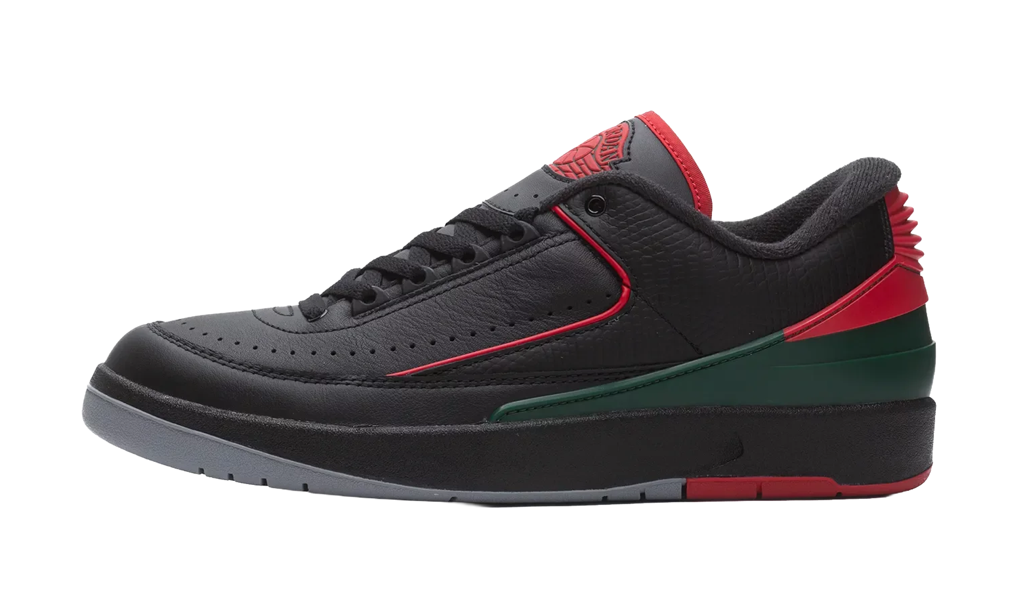 The Air Jordan 2 Low “Christmas” is a colorway of Michael Jordan’s second signature shoe inspired by the wintertime holiday. Also said to be inspired by the Jordan 2’s original “Made in Italy” roots, the “Christmas” colorway has a black, red, and green color scheme that nods to both Christmas colors and the colors found on the Italian flag. The upper features a black leather construction with red piping on the mid-panel. A red and green heel counter and a “Wings” logo on the tongue add to the Christmas-inspired look. Underfoot, a black midsole and a grey and red outsole put the finishing touches on the design. Release date: December 16, 2023