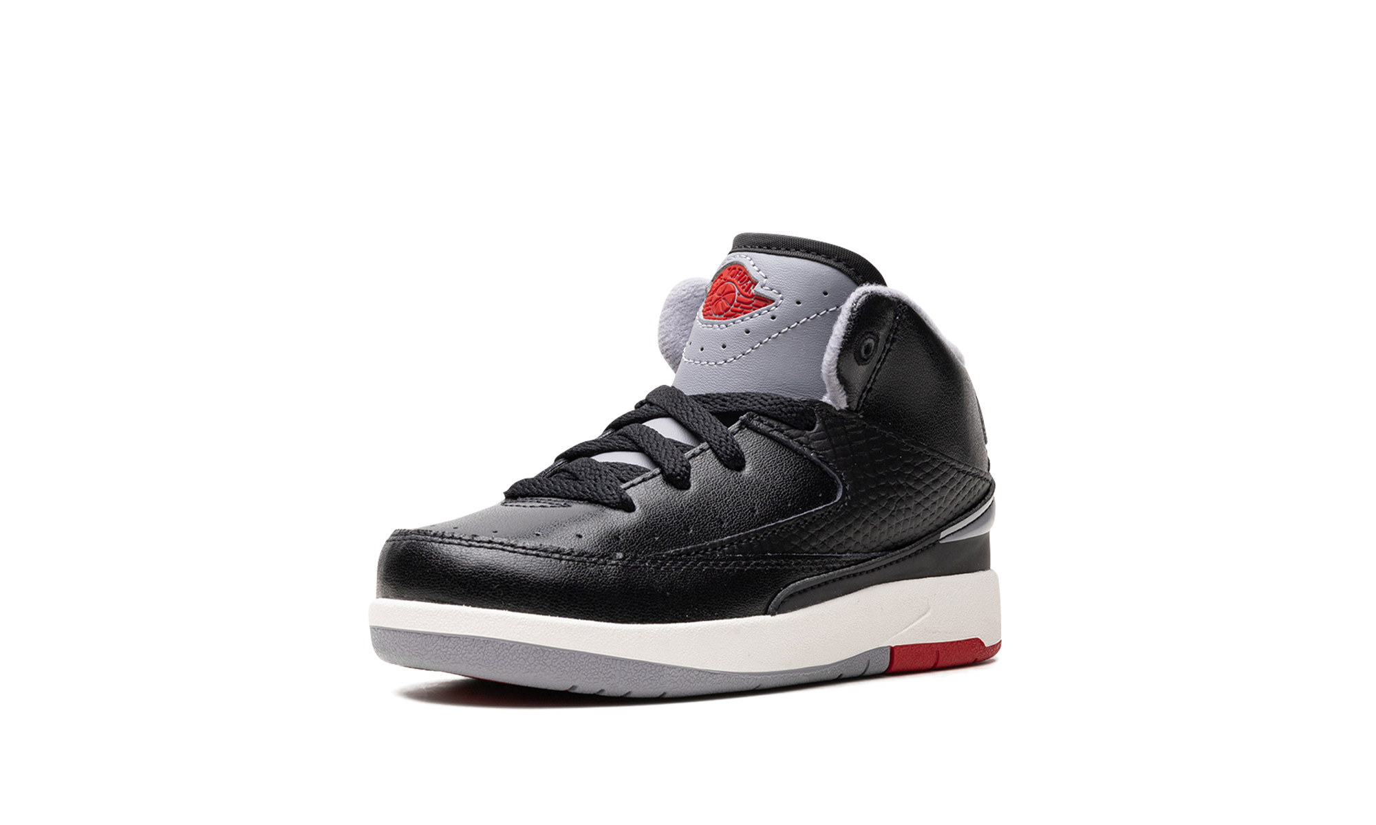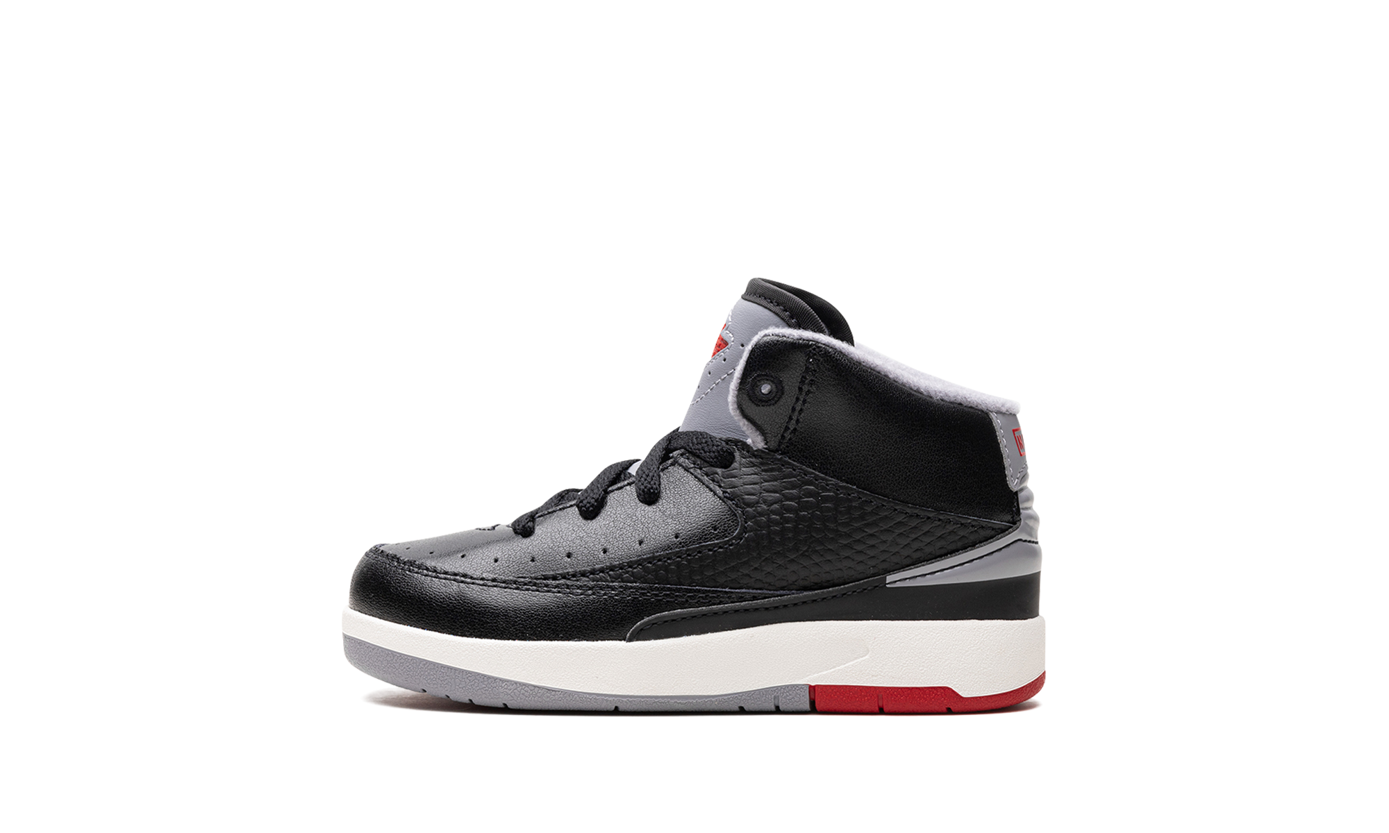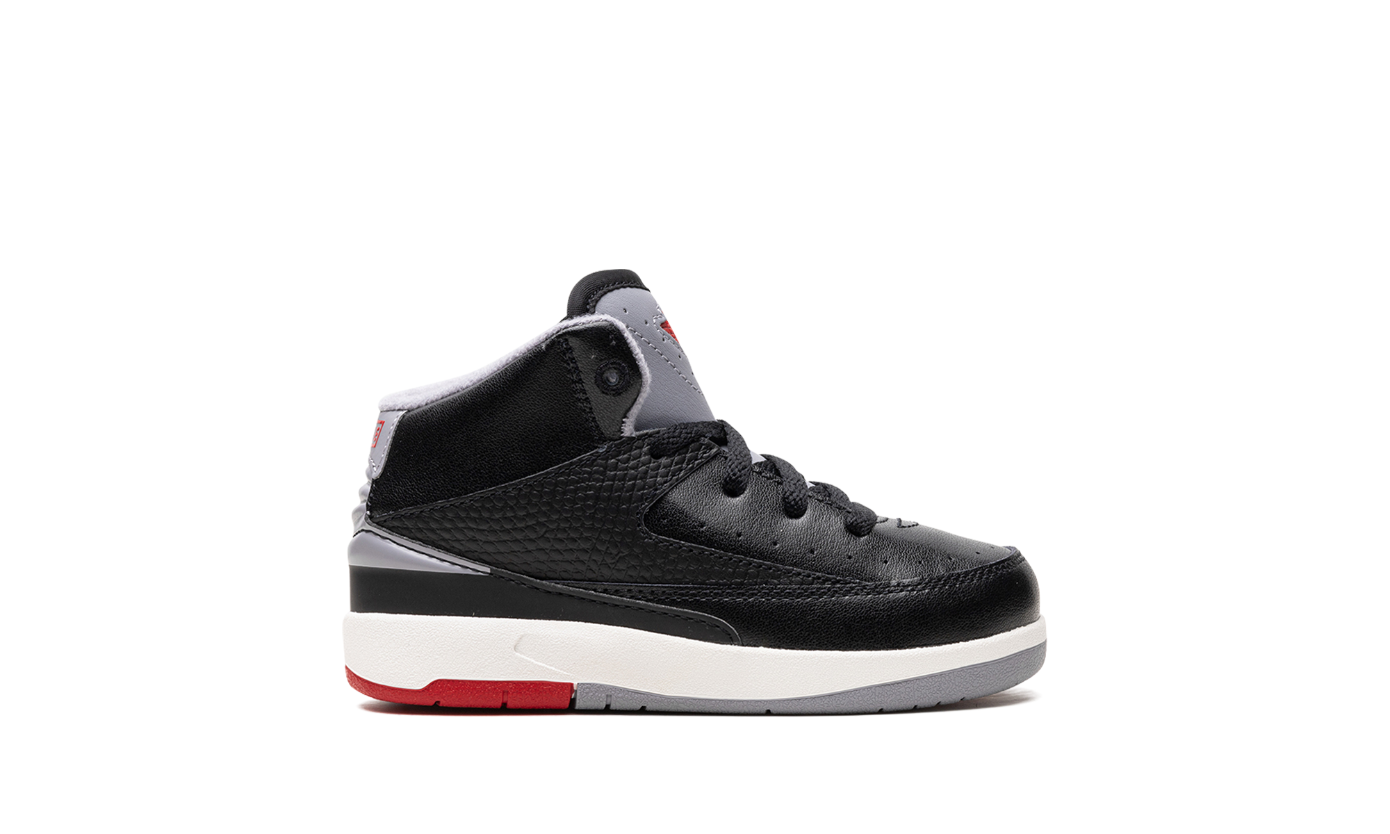 The Air Jordan 2 Retro TD “Black Cement” is the toddler sizing of Michael Jordan’s second signature shoe in a colorway inspired by a legendary Air Jordan style. The shoe in question is the Air Jordan 3 “Black Cement,” one of the most iconic sneakers of all time. The “Black Cement” Jordan 2 mimics the Jordan 3 of the same nickname’s look with black, grey, and red detailing. The design has a black leather construction with contrasting Cement Grey accents on the heel, tongue, and inner lining. A red “Wings” logo appears on the tongue. Underfoot, the white midsole is paired with a red and grey rubber outsole. Release date: September 23, 2023