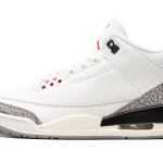 The Air Jordan 3 “White Cement Reimagined” is a special version of the classic basketball sneaker that replicates the model’s original design. Released by Jordan Brand in 2023 to celebrate the iconic Jordan 3’s 35th anniversary, the “White Cement Reimagined” retains the look of the model’s “White Cement” colorway with accurate-to-original panels, colors, and overall shape. Faithful to the 1988 version of the Jordan 3 “White Cement,” the “Reimagined” features a higher-cut ankle collar inspired by the OG Jordan 3’s design. It also is equipped with a white leather upper with contrasting grey elephant print on the toe and heel, which has also been modified to look like the detailing on the original Jordan 3. The “Nike Air” branded heel counter has an aged, vintage look, as does the midsole. A red Jumpman logo is embroidered on the tongue. Release date: March 11, 2023