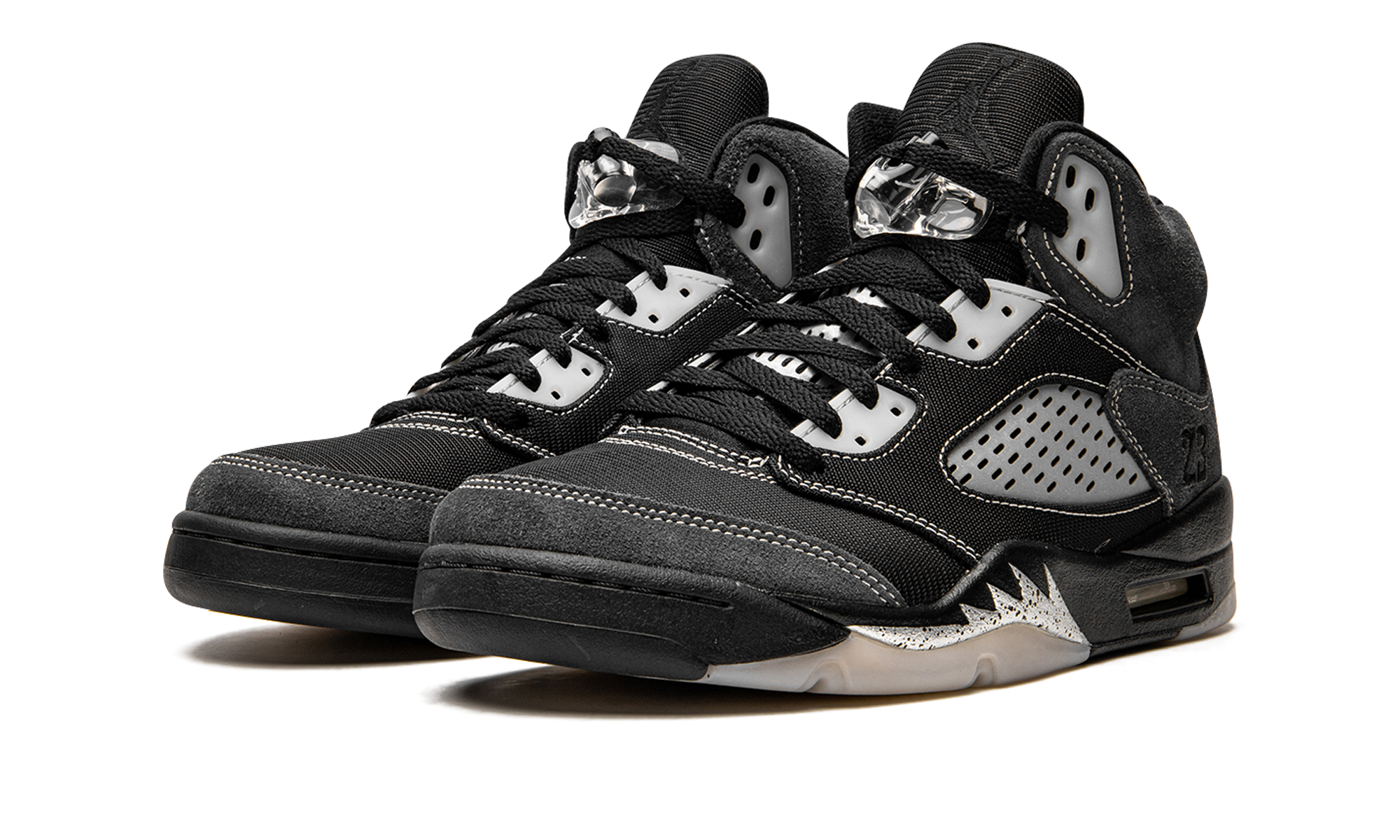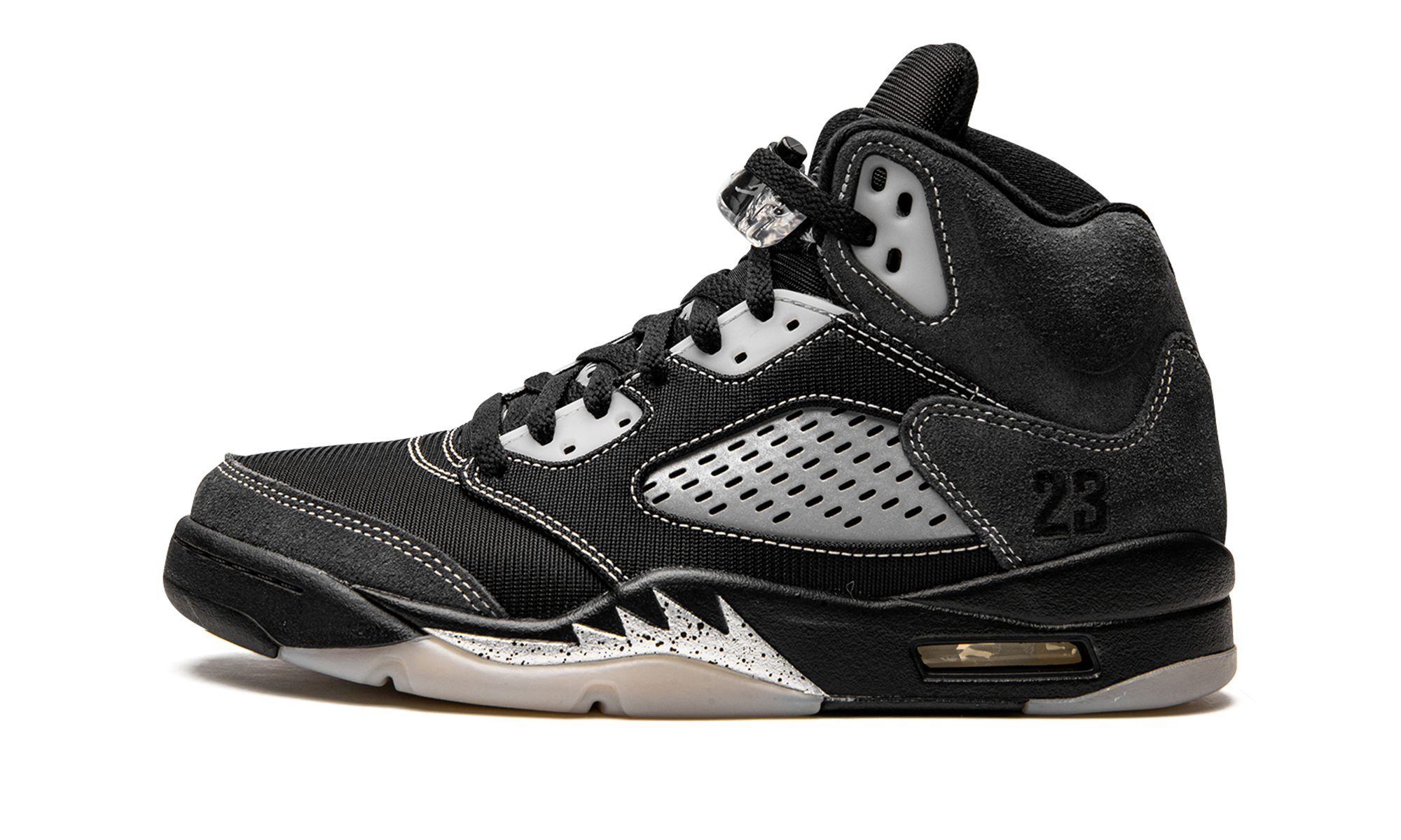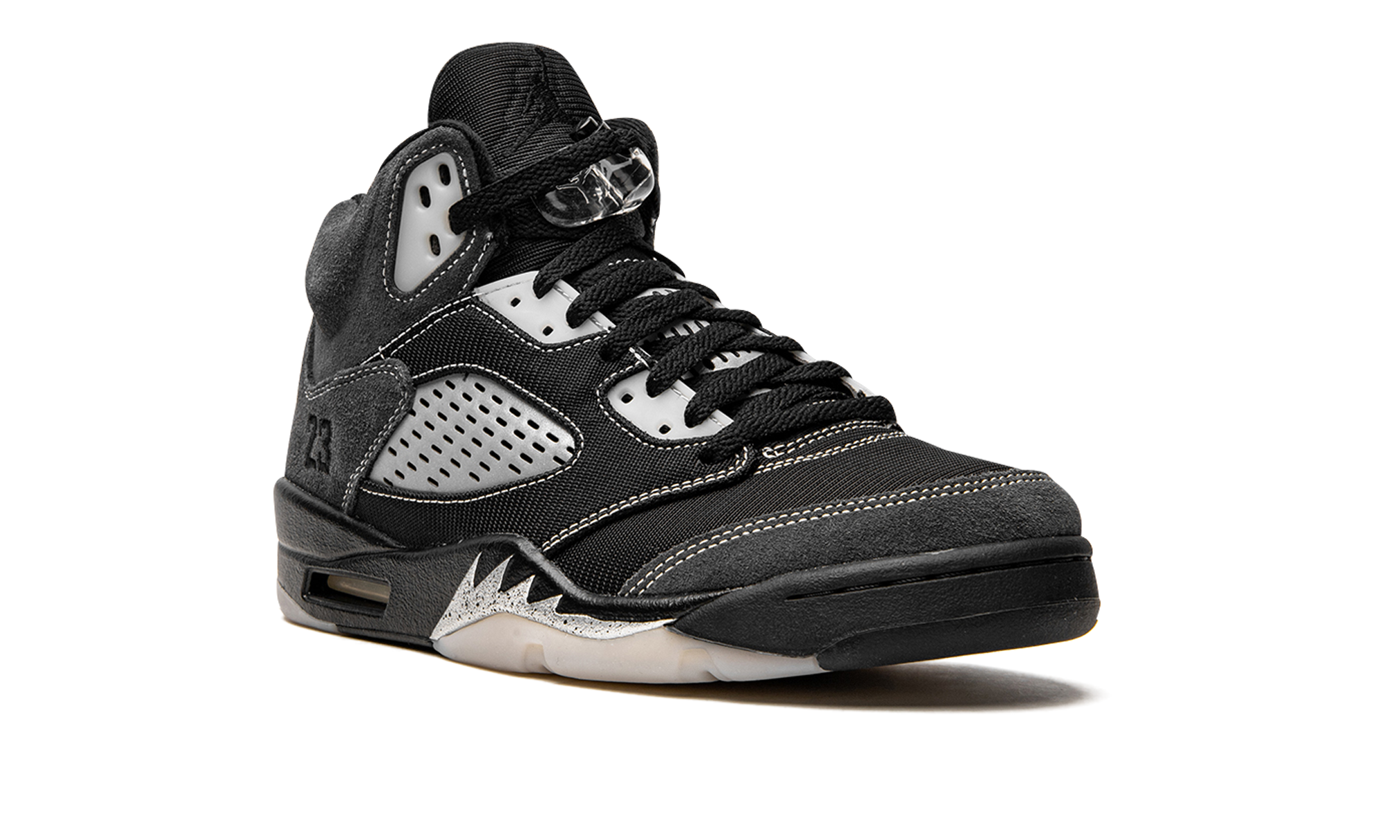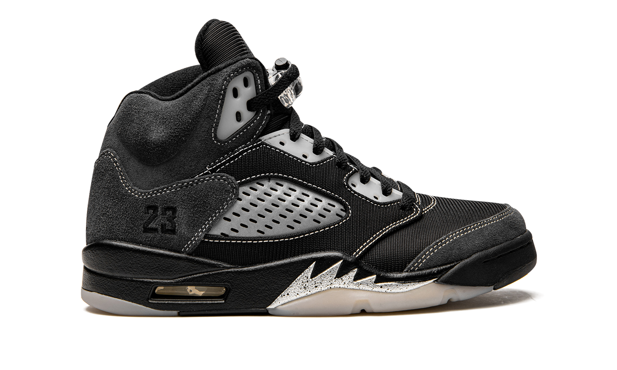 The Air Jordan 5 “Anthracite” is a recontextualized design of Michael Jordan’s fifth signature shoe that features reflective panels. This February 2021 release switches up the look of the all-time classic Jordan 5 silhouette by employing the reflective material typically found on the tongue to the clear netting on the bottom of the tongue and the mid-panel. Elsewhere, Jordan Brand places soft black mesh on the toe, mid-panel, and eyelets. Plush Anthracite or grey suede detailing is located on the collar, quarter panel, and toe cap. White contrast stitching outlines the aforementioned panels. The tonal embroidered “23” branding found on the heel is in reference to the original Player Exclusive version of the Air Jordan 5 worn by Michael Jordan with the Chicago Bulls in 1991. A black Jumpman logo appears on the black mesh tongue, on the back of the shoe, and on the insole. Silver shark tooth detailing highlights the black midsole to complete the look. Release date: February 6, 2021.