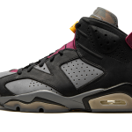 The Air Jordan 6 “Bordeaux” is a special colorway of Michael Jordan’s sixth signature shoe that’s dressed in a familiar color scheme to another iconic Air Jordan style. The shoe in question is the Air Jordan 7 “Bordeaux,” an original colorway of the retro performance basketball shoe worn by Michael during the 1991-92 NBA season with the Chicago Bulls. Released in September 2021, the modern “Bordeaux” is part of the Air Jordan 6’s 30-year anniversary. The upper is complete with a grey synthetic nubuck base that features perforations on both sides. Contrasting black overlays break up the look. Bordeaux accenting comes into play on the neoprene tongue with black Jumpman branding and on the spoiler on the heel. “Air Jordan” detailing is found on the semi-translucent tongue tab. A black Jumpman is embroidered on the heel. The signature geometric pattern of the Jordan 7 is found printed on the inner side of the tongue. True to the original Air Jordan 6, a visible Air bubble can be found in the heel of the grey and black midsole. Release date: September 4, 2021