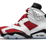 The Air Jordan 6 “Carmine 2021” is an original colorway of Michael Jordan’s sixth signature shoe that was re-released by Jordan Brand in 2021. This version of the “Carmine” brings back the original “Nike Air” branding on the back of the shoe for the first time since the colorway’s debut in 1991. The return to the “OG” styling coincides with the Jordan 6’s 30-year-anniversary celebration in 2021. Along with the “Nike Air” embroidery on the heel, the rest of the shoe retains the correct height and panel shapes as the inaugural release. That includes white leather overlays on the forefoot, mid-panel, and eyelets above the fiery red synthetic nubuck base. Perforations on either side of the shoe and collar are consistent with the original styling of the Air Jordan 6. A black liner and neoprene lace shroud with black Jumpman embroidery compliment the shoe’s retro style. The “Nike Air” logo on the heel sits beneath a spoiler-style heel tab to complete the look. Release date: February 13, 2021.