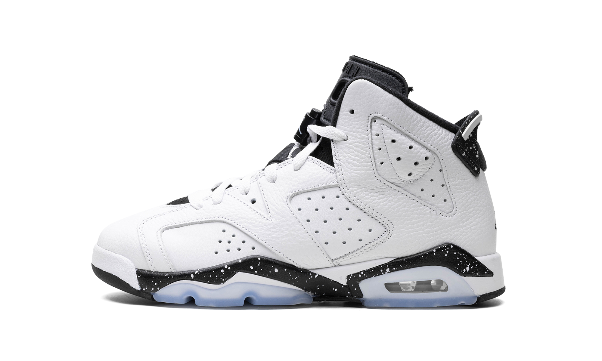 The Air Jordan 6 GS “Reverse Oreo” is the youth sizing of the colorway of Michael Jordan’s sixth signature shoe in the popular, cookie-inspired theme. The “Oreo” colorway was introduced on the Air Jordan 4 in 1999, and has been used on countless Air Jordan models over the years, including on the Jordan 6. The upper features a white leather design with tonal overlays and perforations for breathability on the sides and collar. The tongue and Jumpman logos on the tongue and heel appear in black, while the midsole and heel spoiler feature black-and-white speckle detailing in an “Oreo” inspired design. An icy blue translucent outsole completes the look. Release date: June 8, 2024