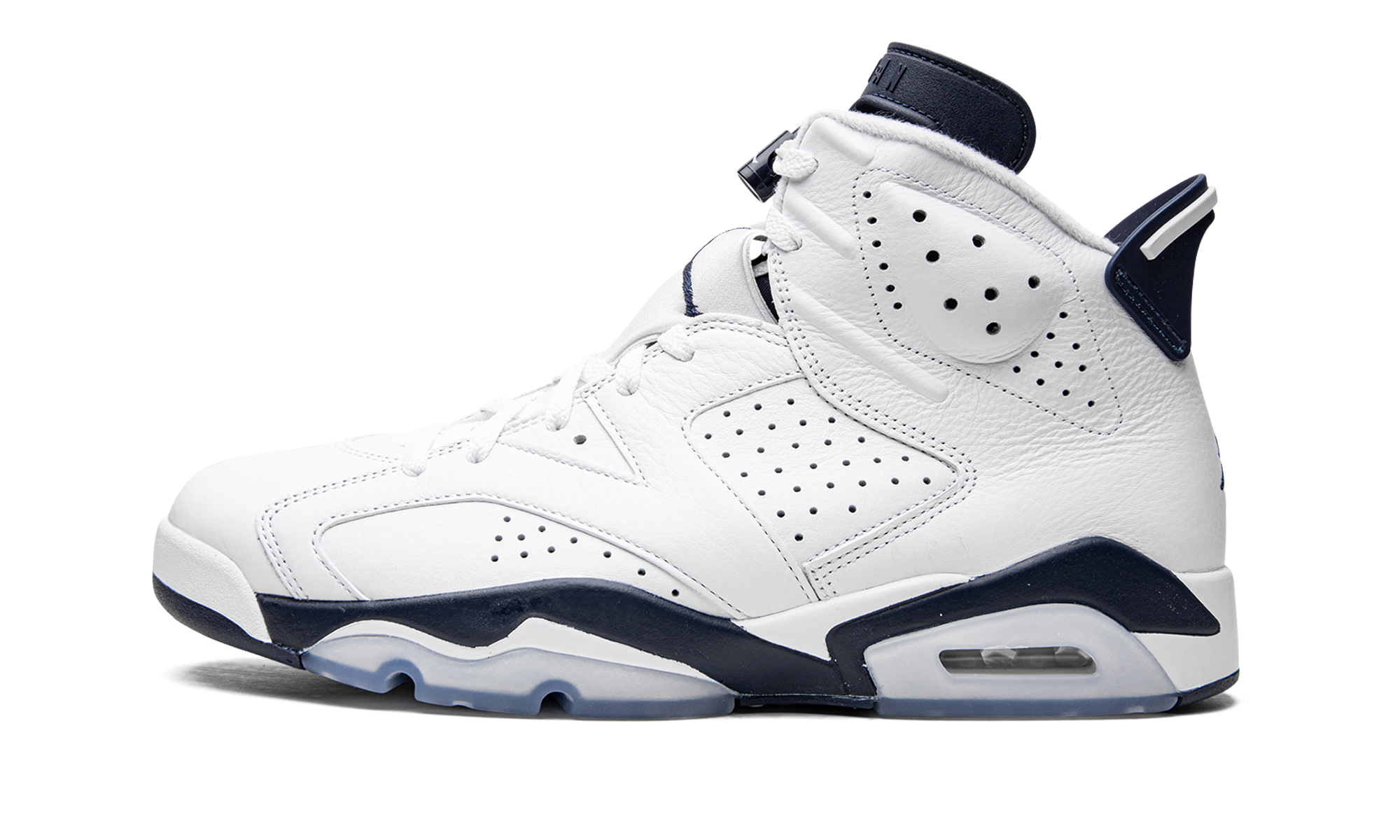 The Air Jordan 6 “Midnight Navy” is a non-original colorway of Michael Jordan’s sixth signature shoe that originally debuted in 2000 and was brought back in early 2022. The “Midnight Navy” was once part of Jordan Brand’s “Retro+” collection, a series of non-original colorways from the late ‘90s and early 2000s that put a new “lifestyle” spin on classic Air Jordan models, like the Air Jordan 6. Interestingly, the “Midnight Navy” colorway of the vintage basketball shoe is styled similarly to the model’s “White Infrared,” “Sport Blue,” and original “Maroon” looks. The entire upper, including the perforated panels on the sides, the perforated collar, and overlays, appear in white tumbled leather. A Midnight Navy Jumpman is embroidered onto the white nylon lace overlay. Additional Midnight Navy accenting comes into play on the lace toggle with white Jumpman branding, on the tongue, and on the spoiler on the heel. A navy blue Jumpman is stitched onto the heel above white “Air” branding. Release date: March 2022